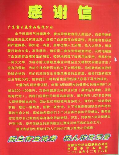 12月20日,我司員工積極到我市中心血站挽起衣袖踴躍參加無償獻(xiàn)血。昨日血站工作人員為我司送來了錦旗和感謝信。